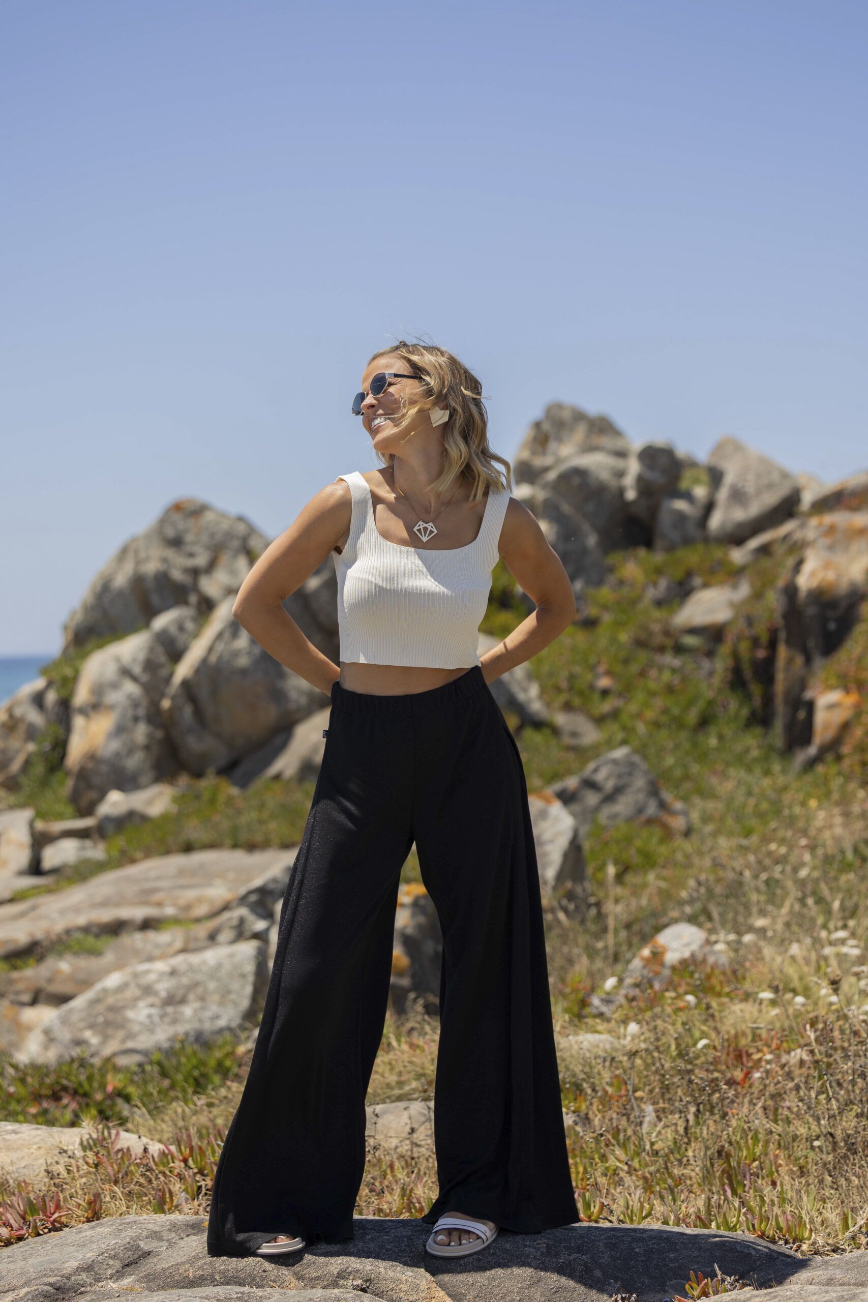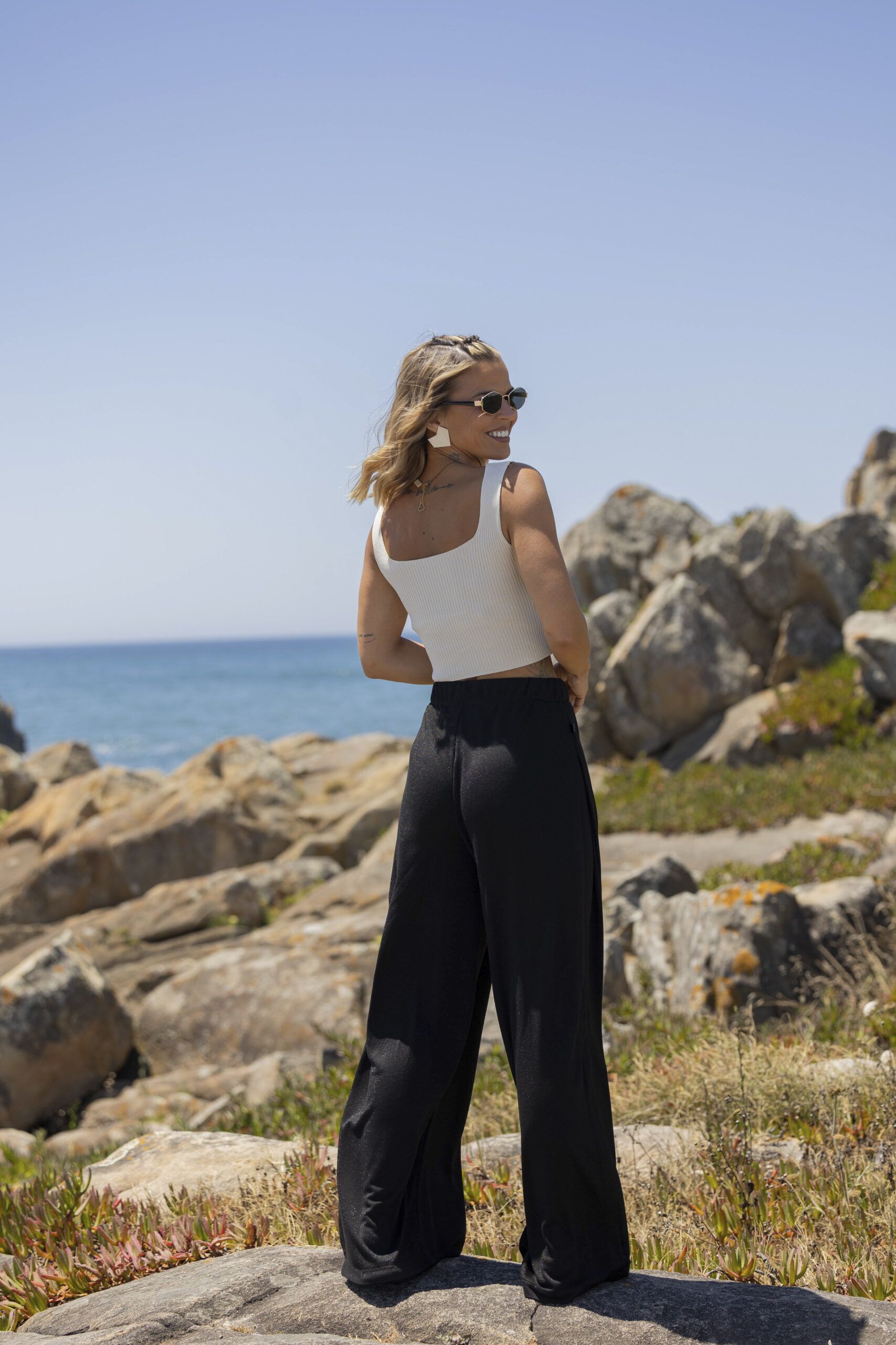 Exclusivo Fox calça malha com brilho subtil, perna larga com efeito racha fechada lateral , elástico na cintura .