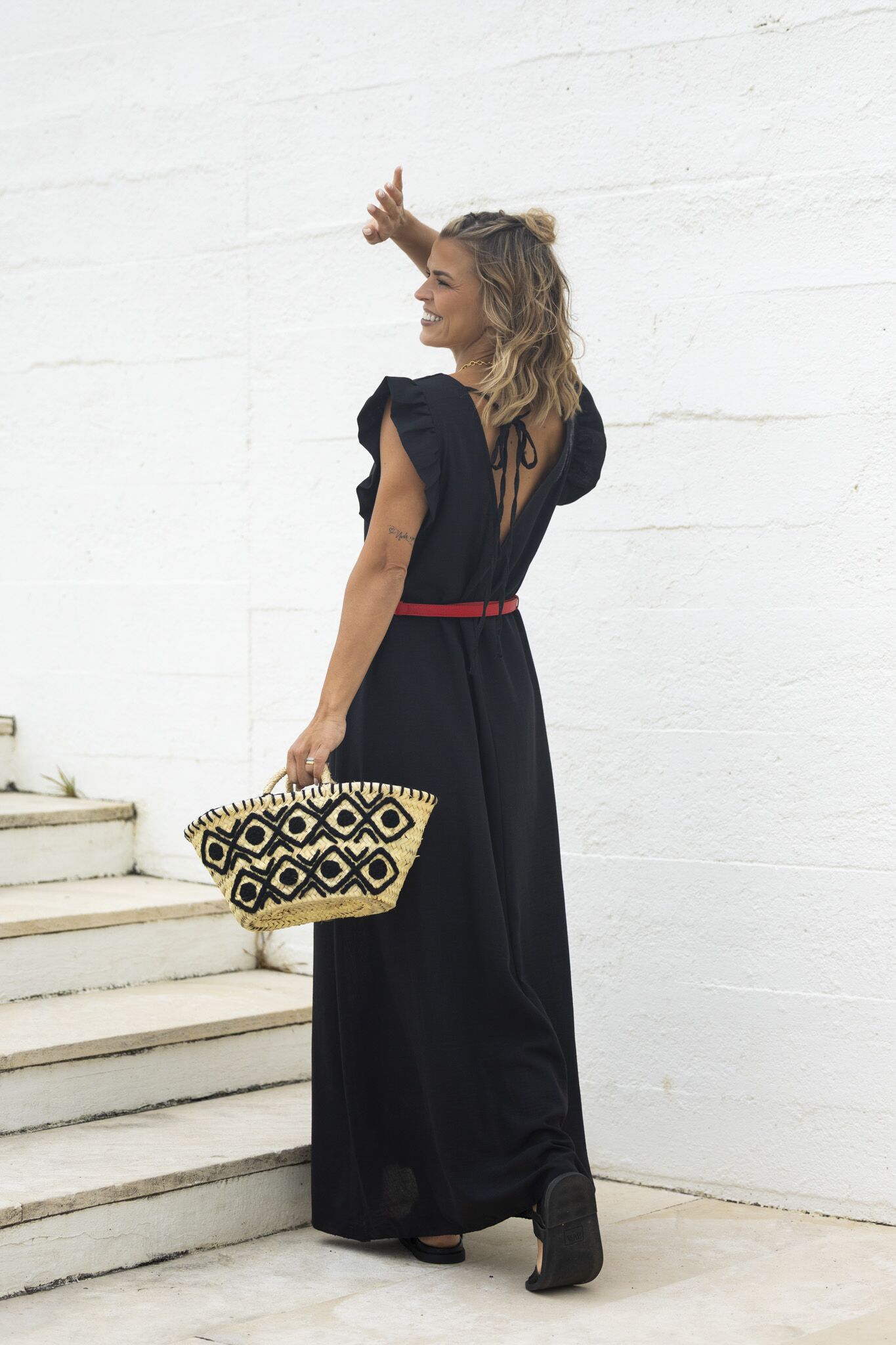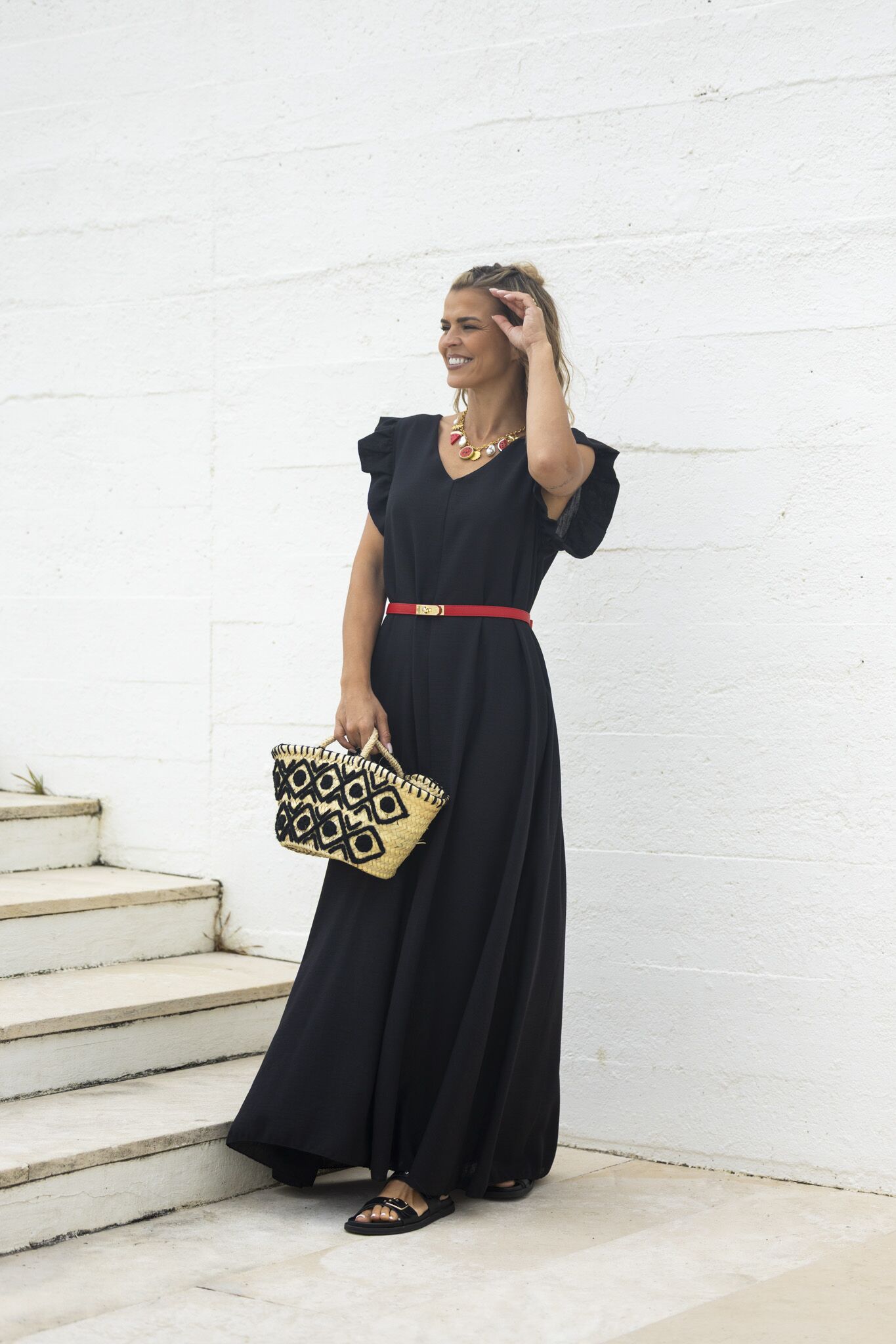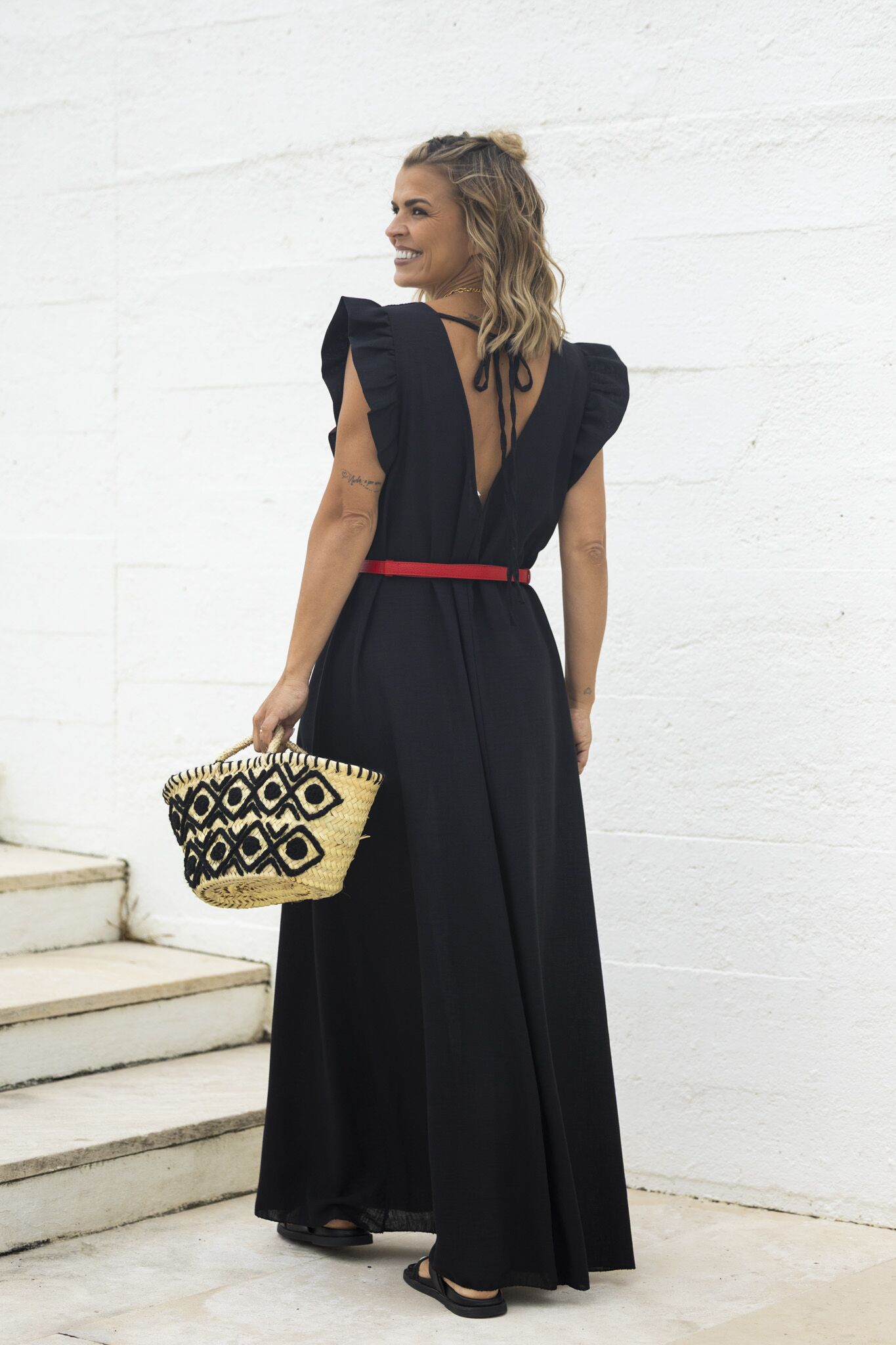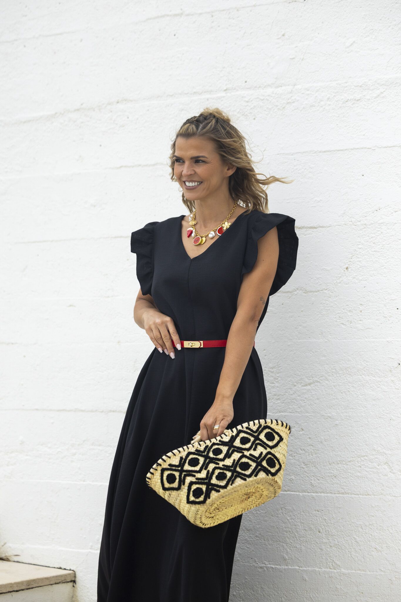 Cesta em palha com bordado preto