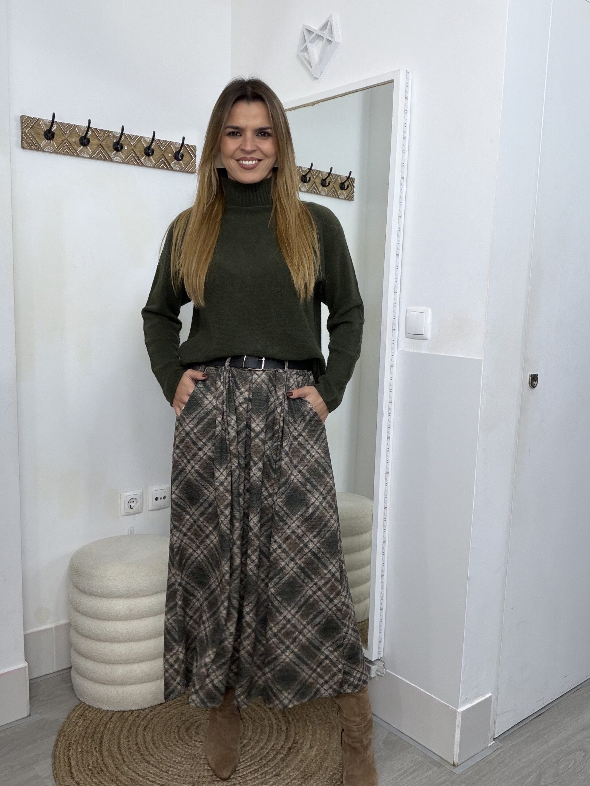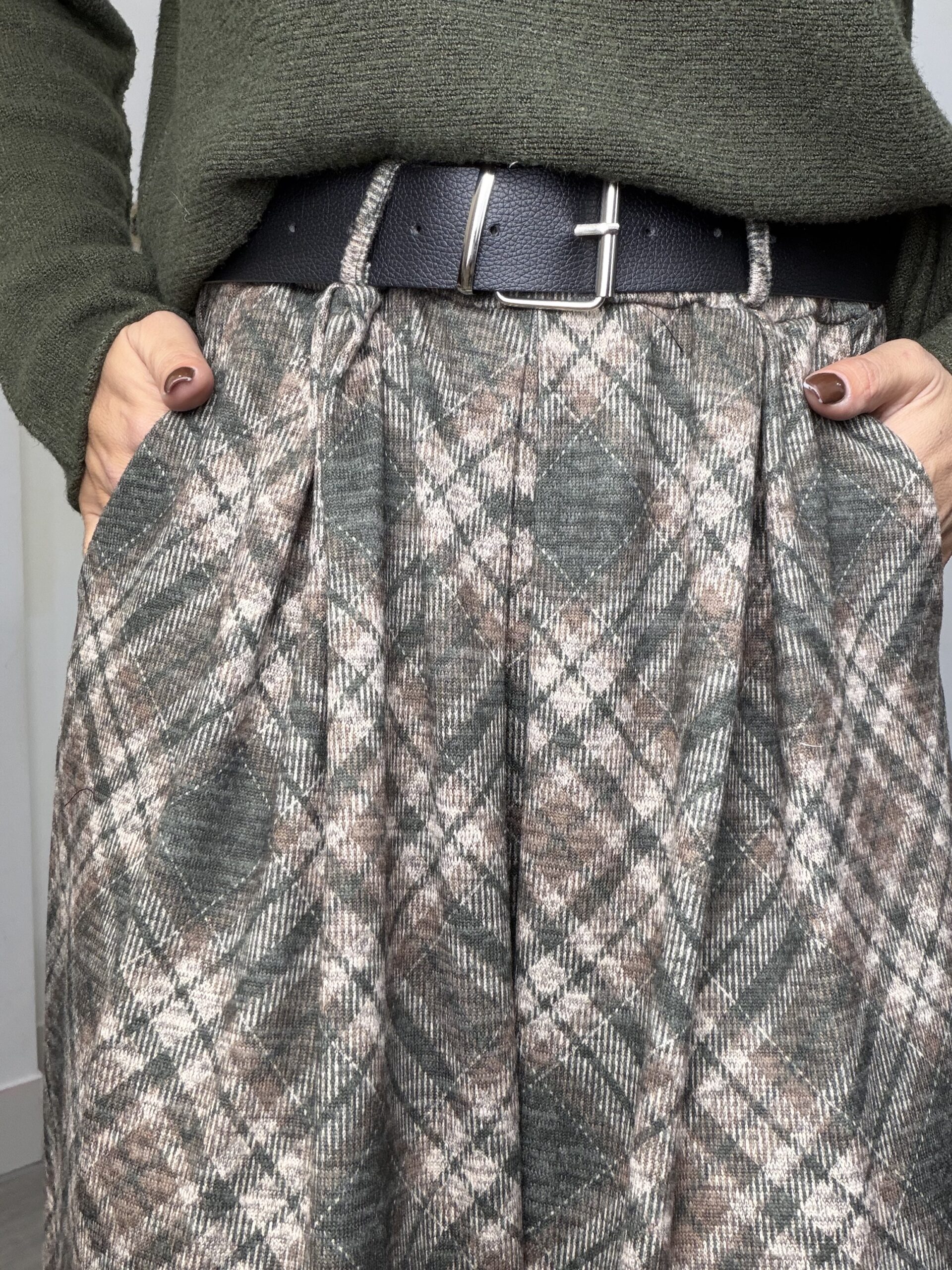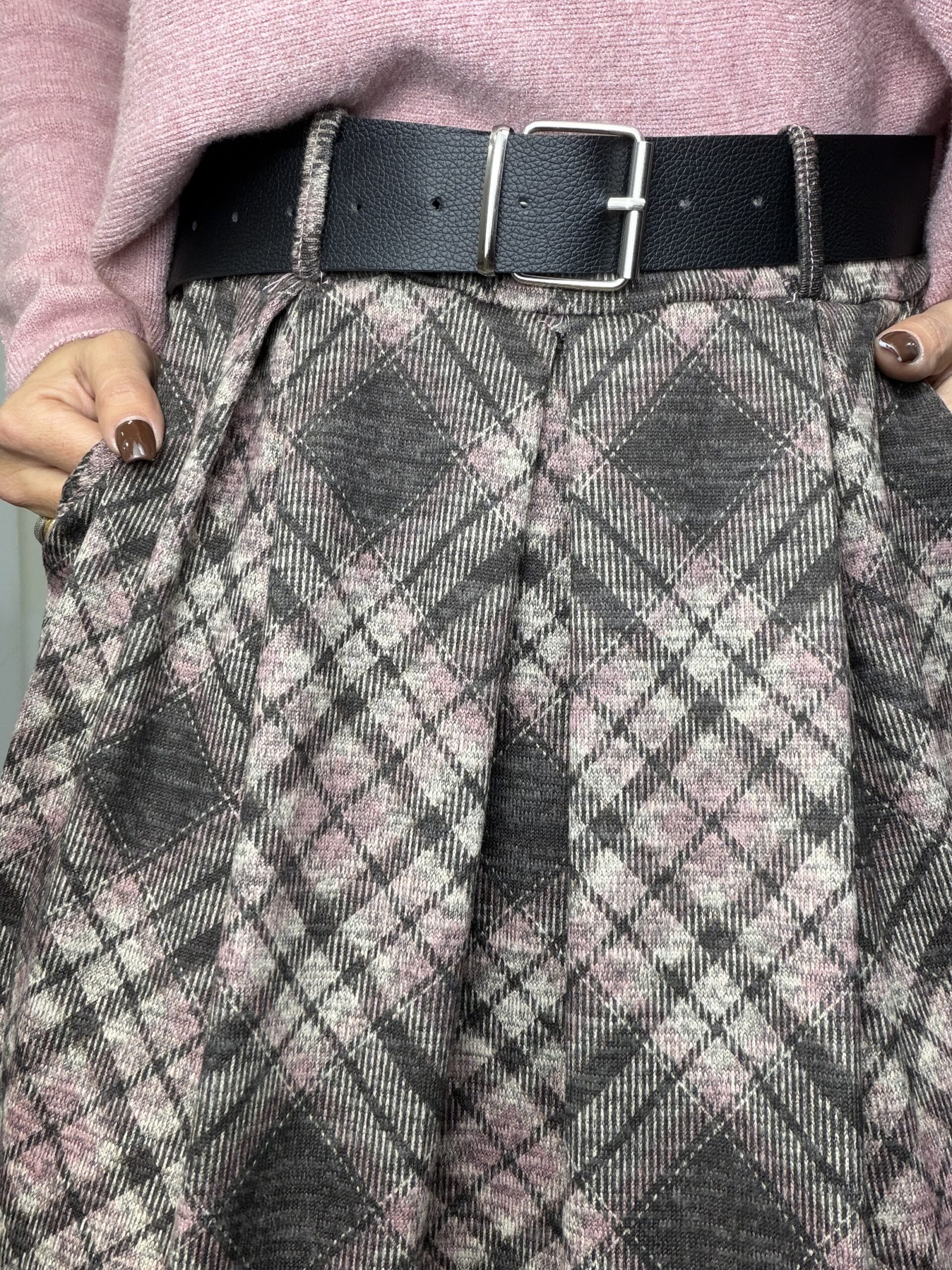 Saia malha fina com prega e bolsos, cinto incluído
