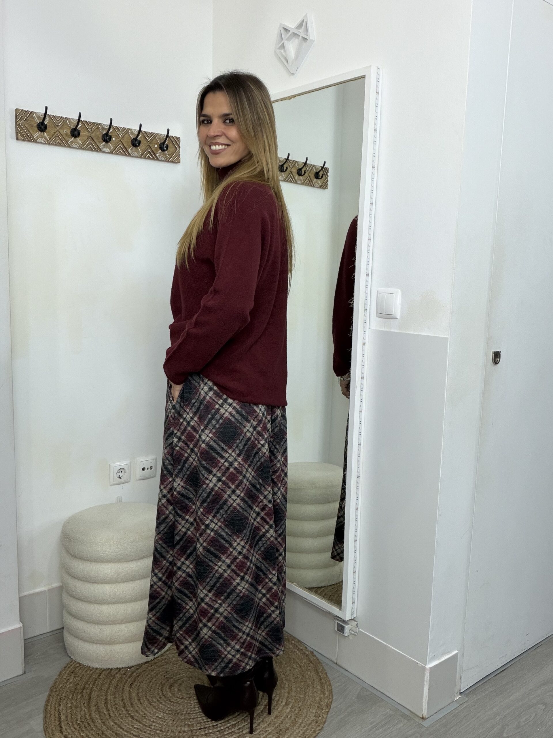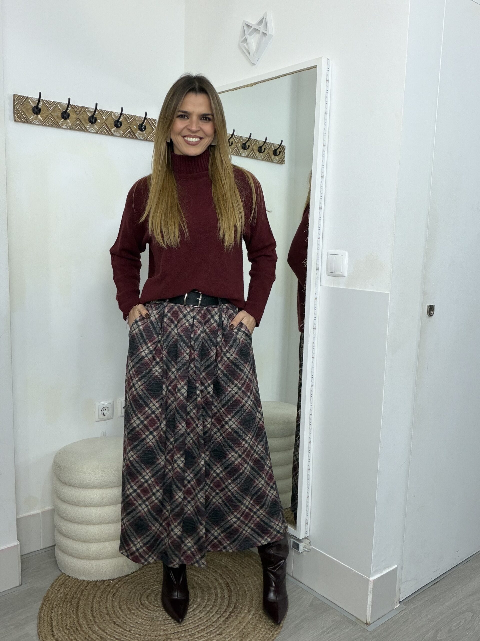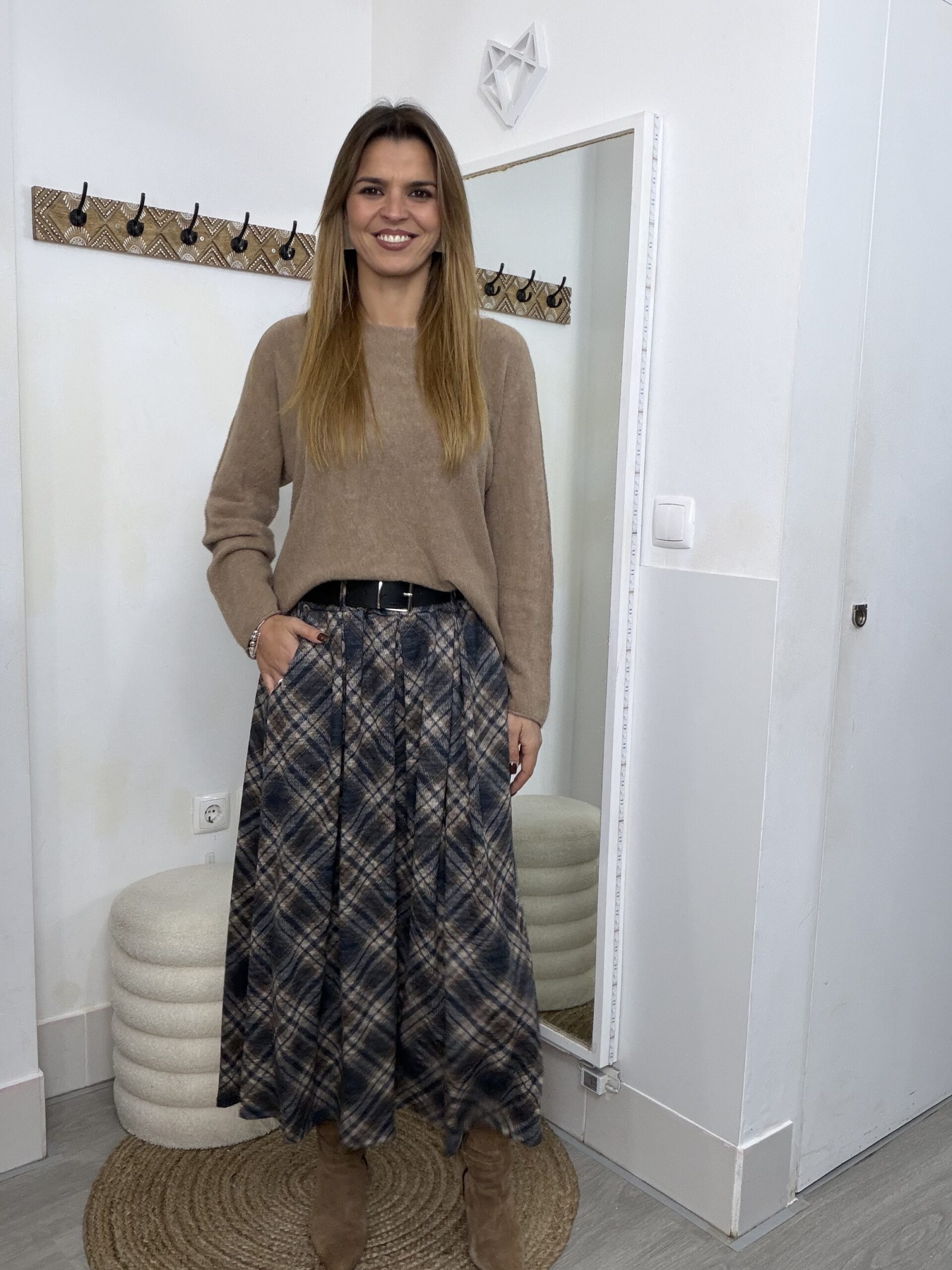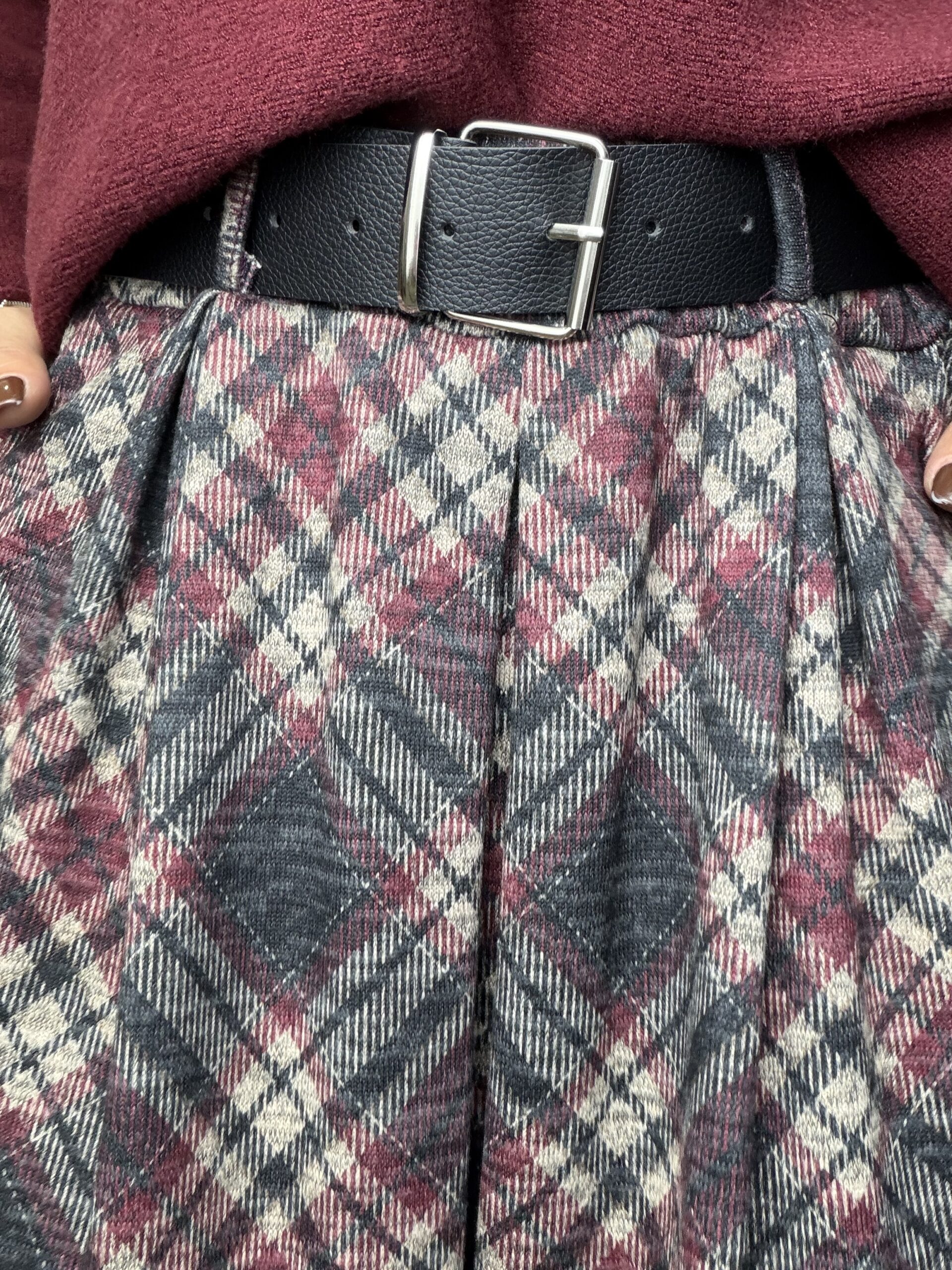 Saia malha fina com prega e bolsos, cinto incluído
