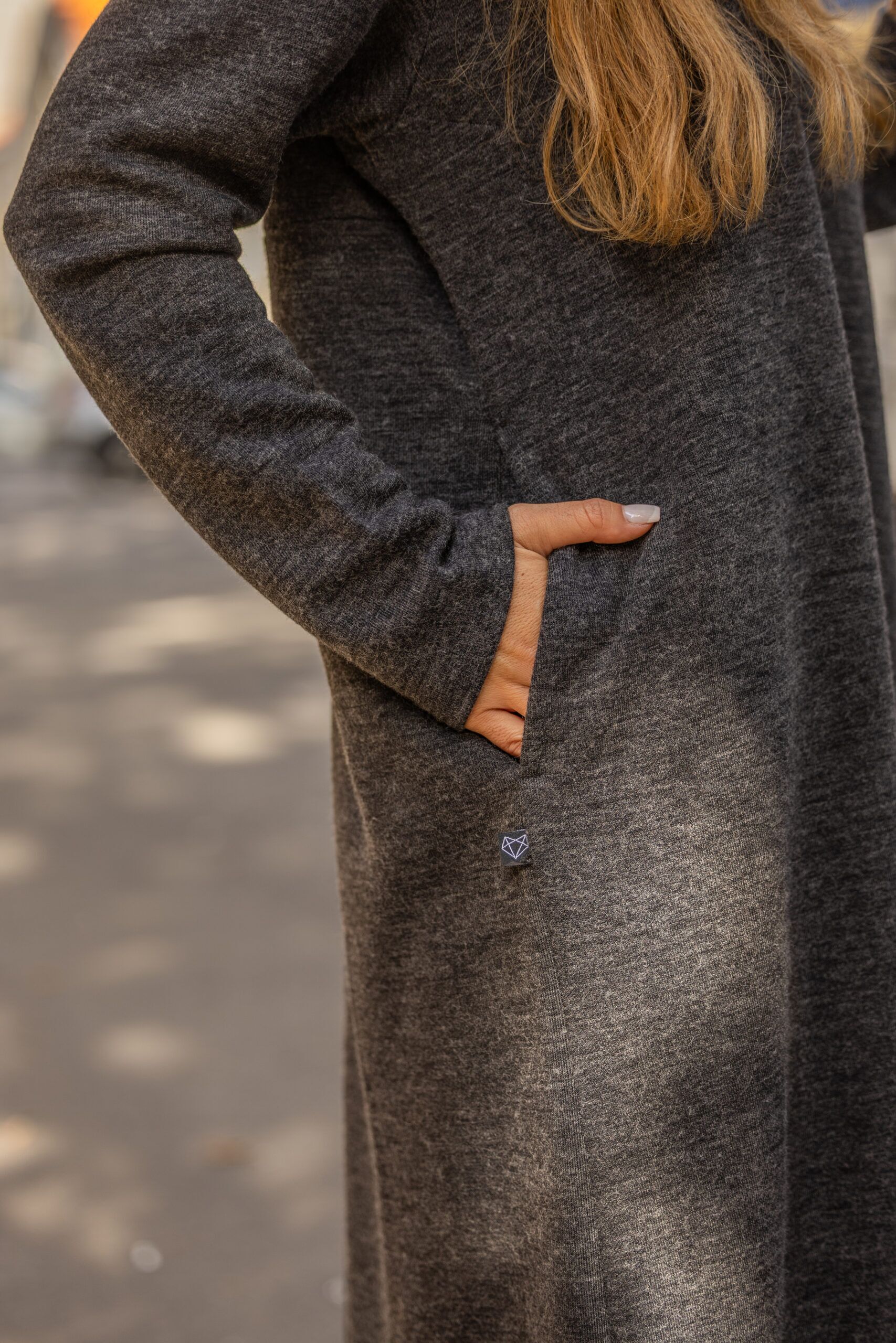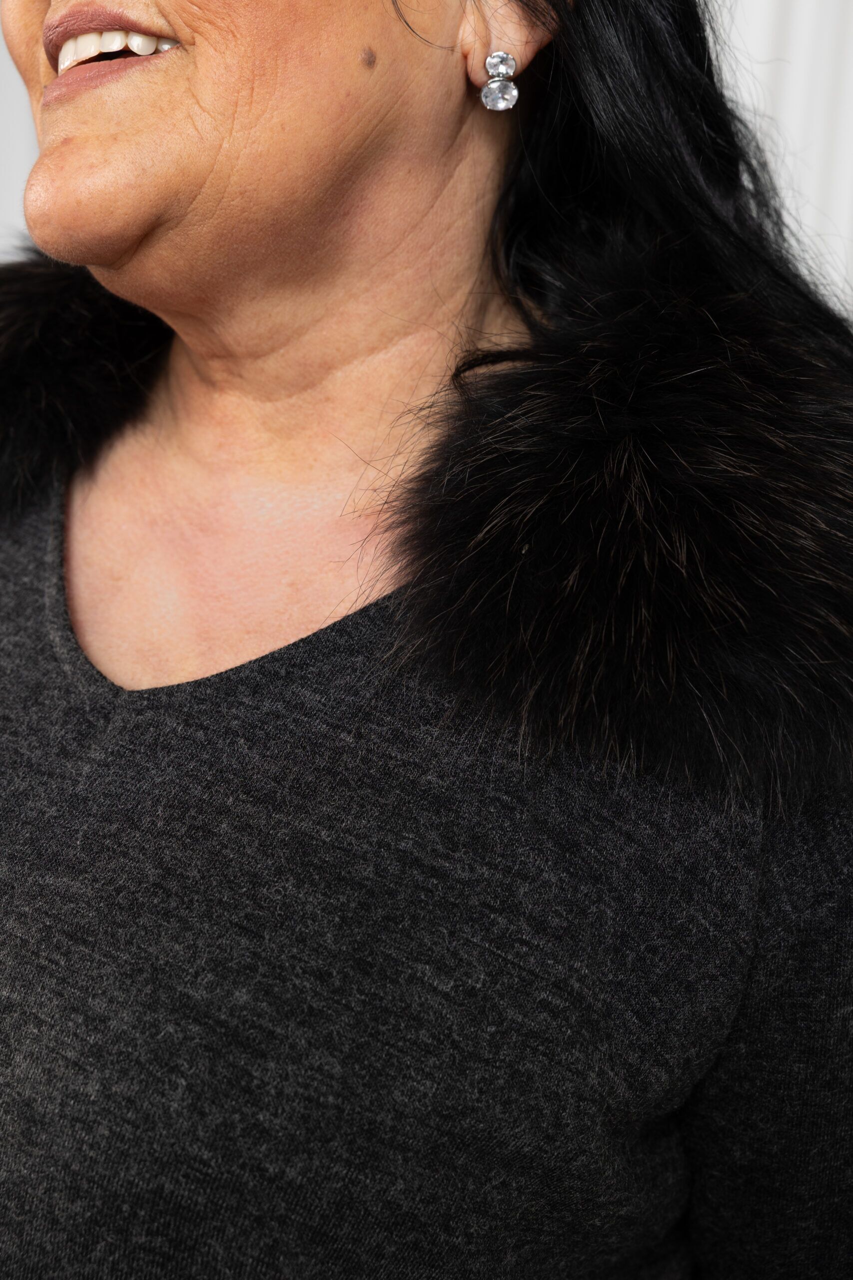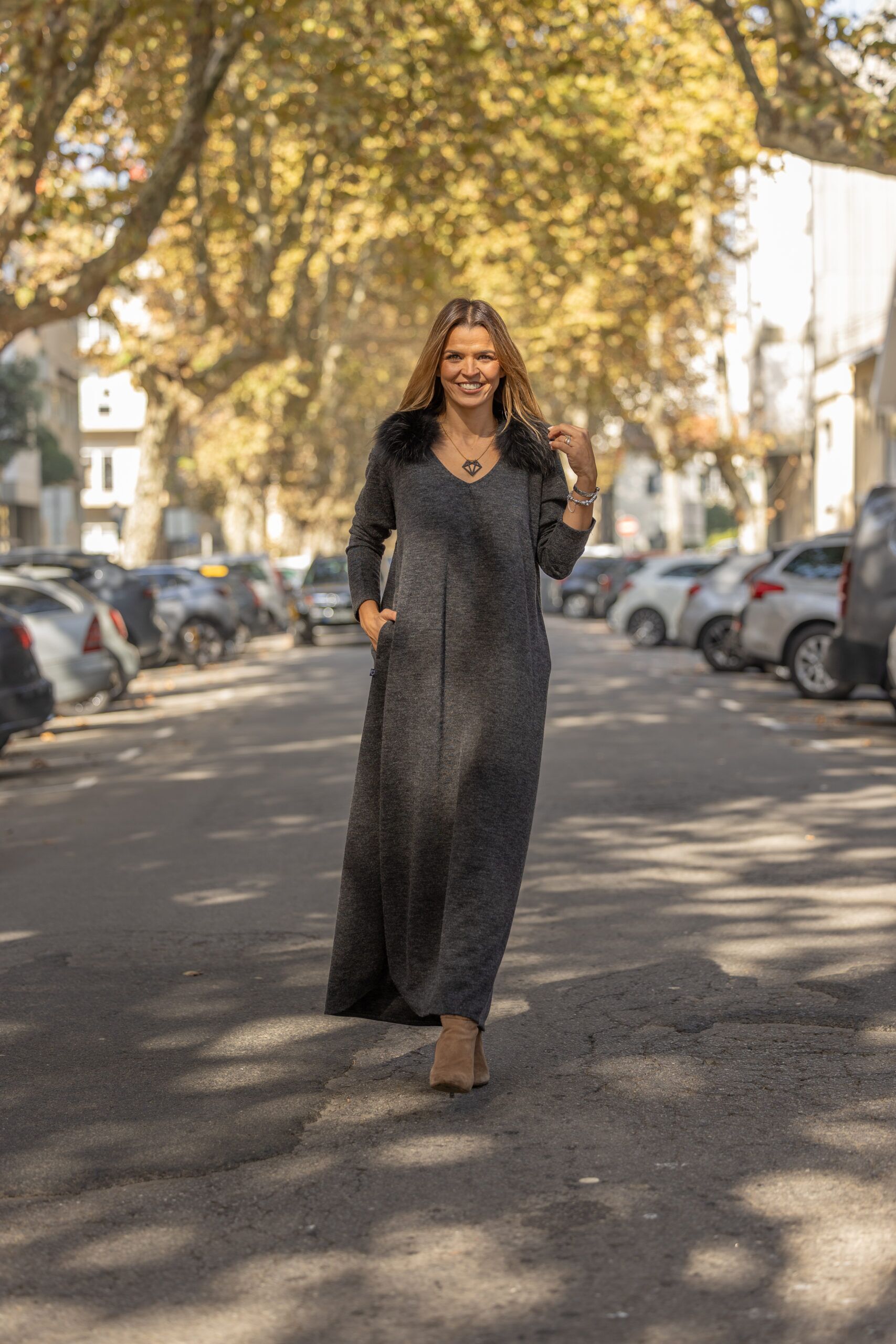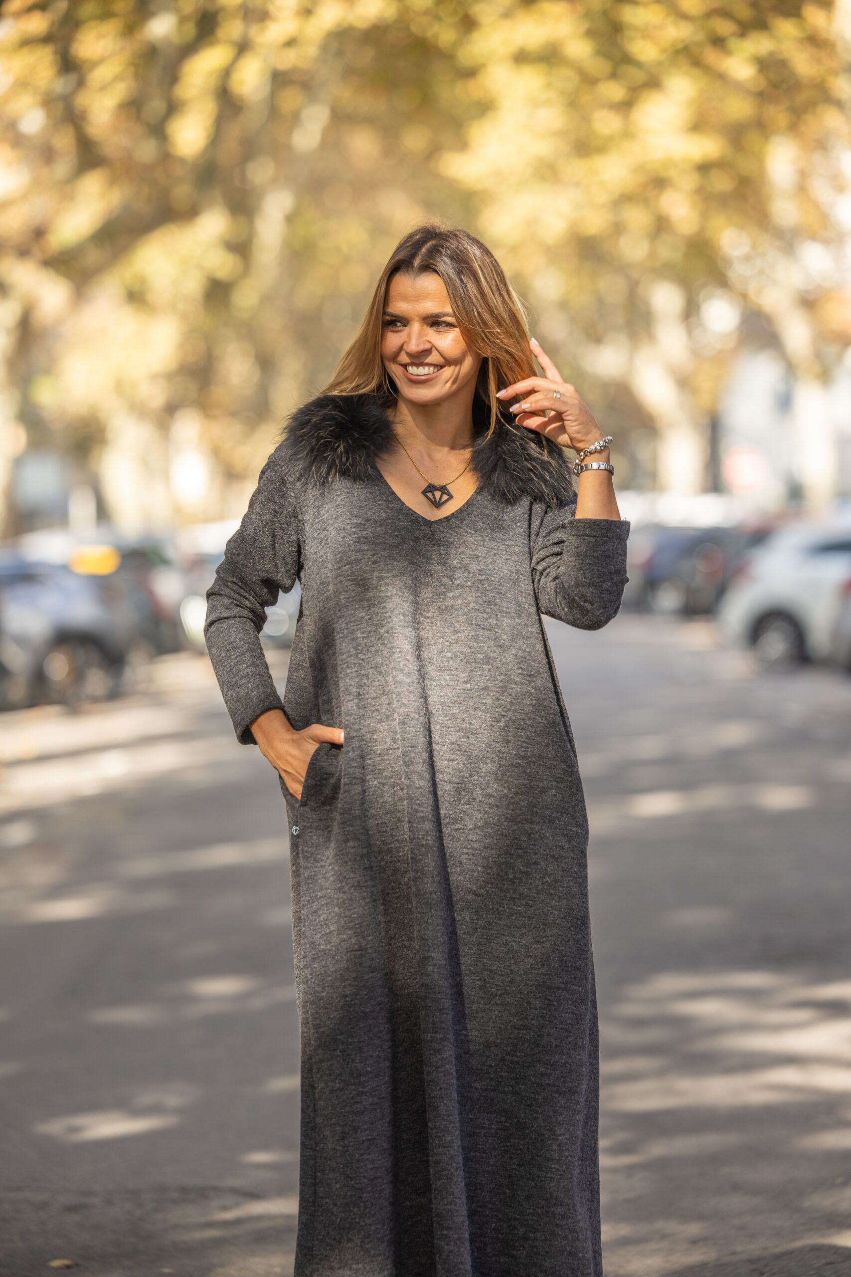 Vestido exclusivo Fox em malha cinza antracite com gola de pelo verdadeiro , gola removível. Com bolsos