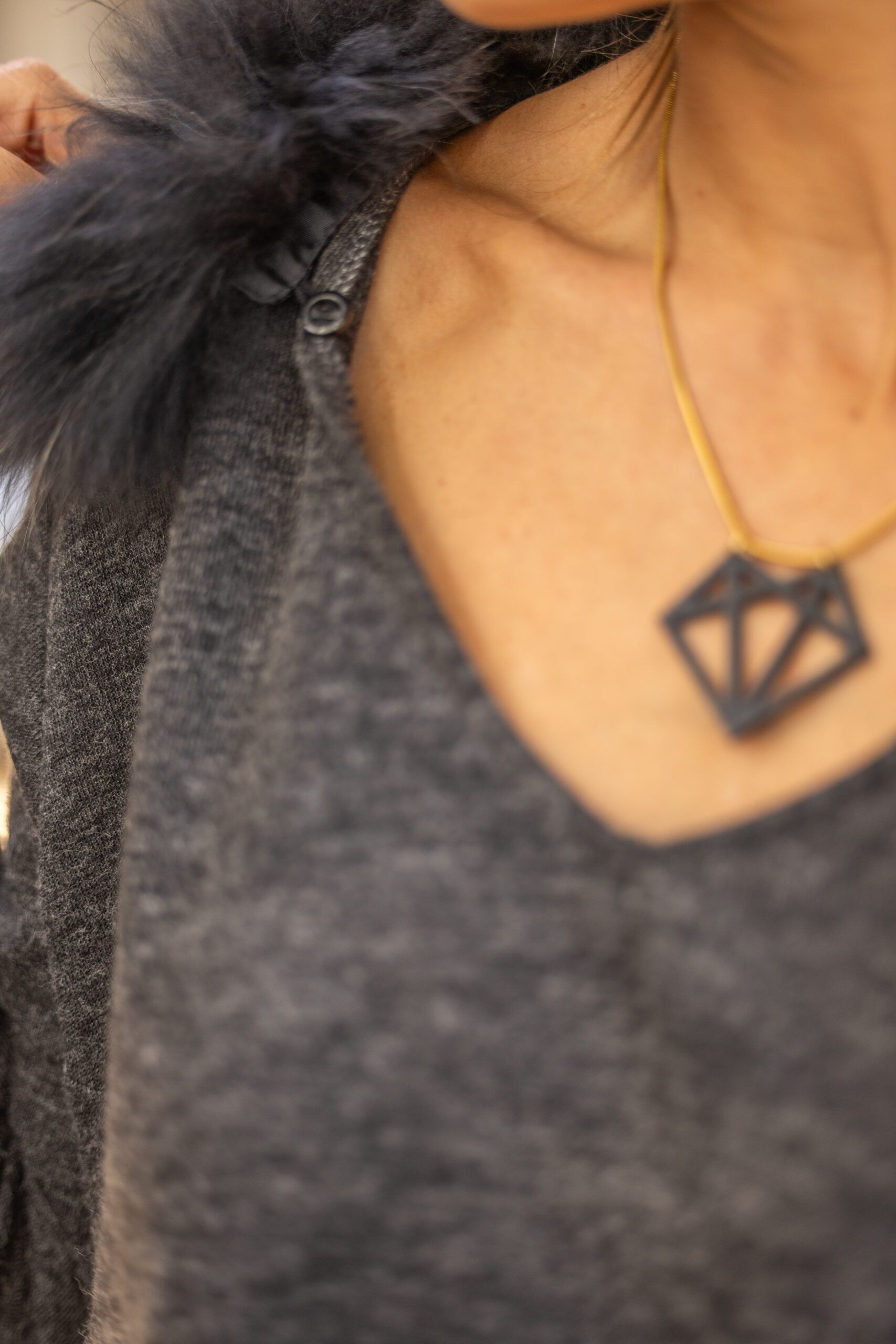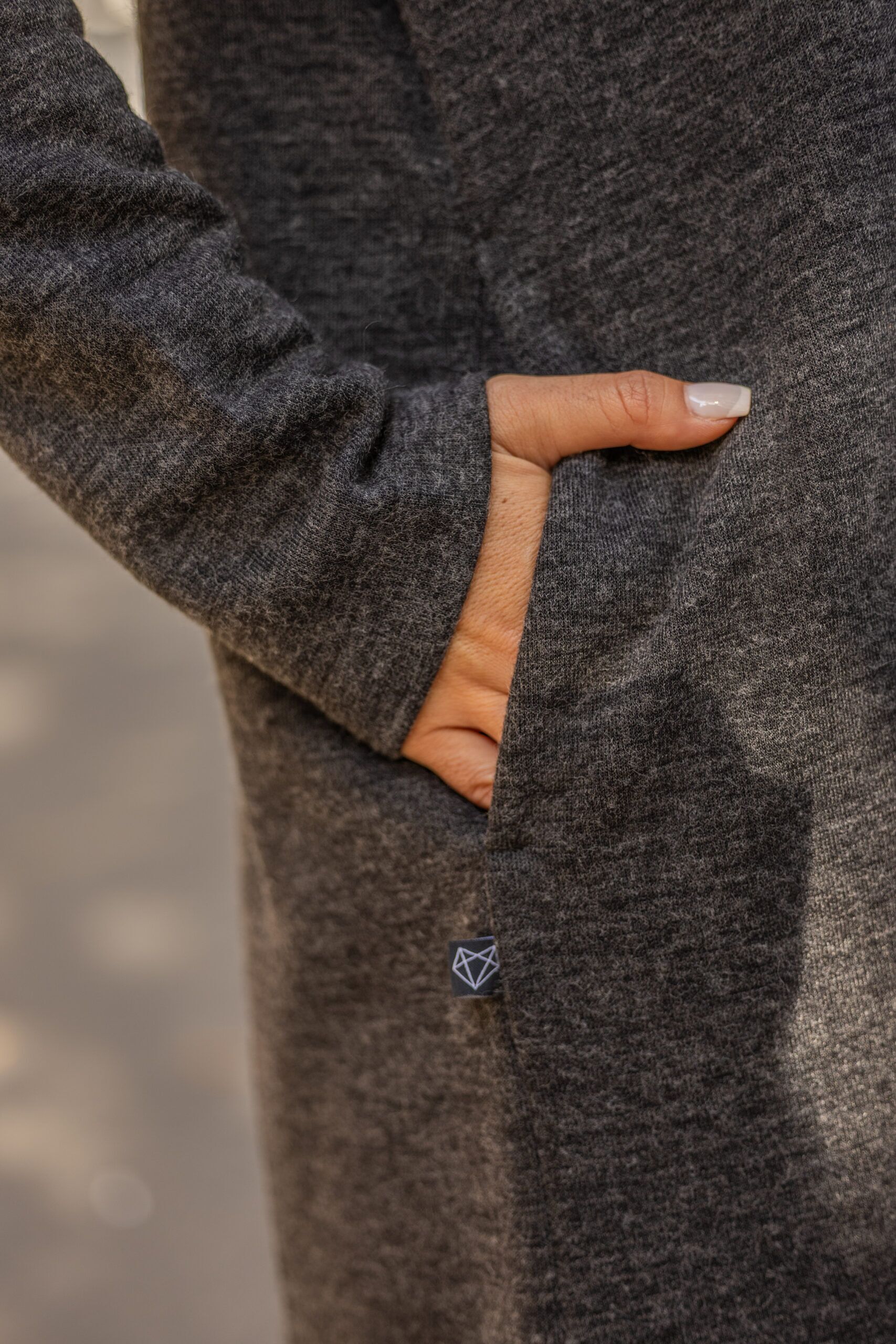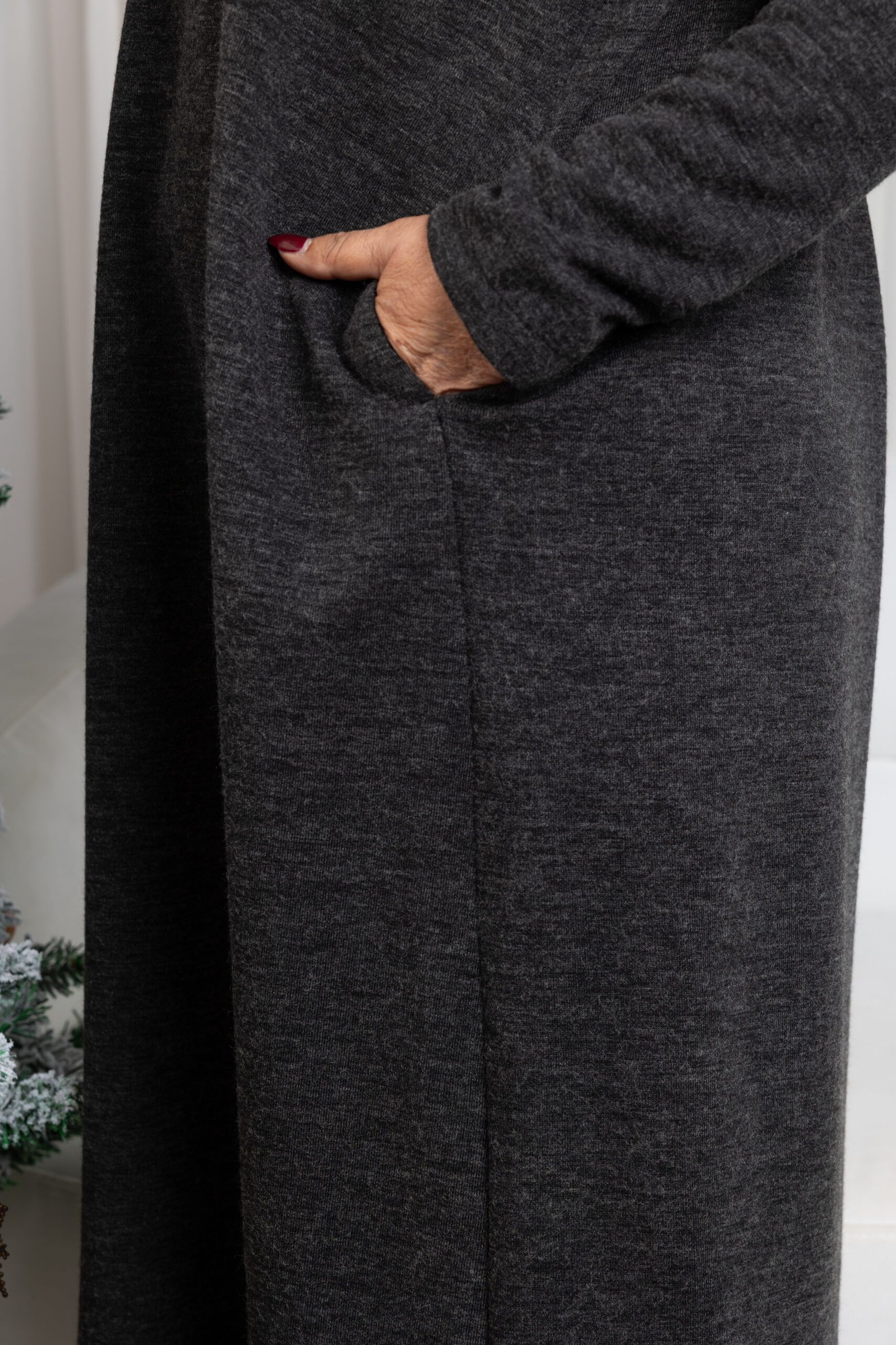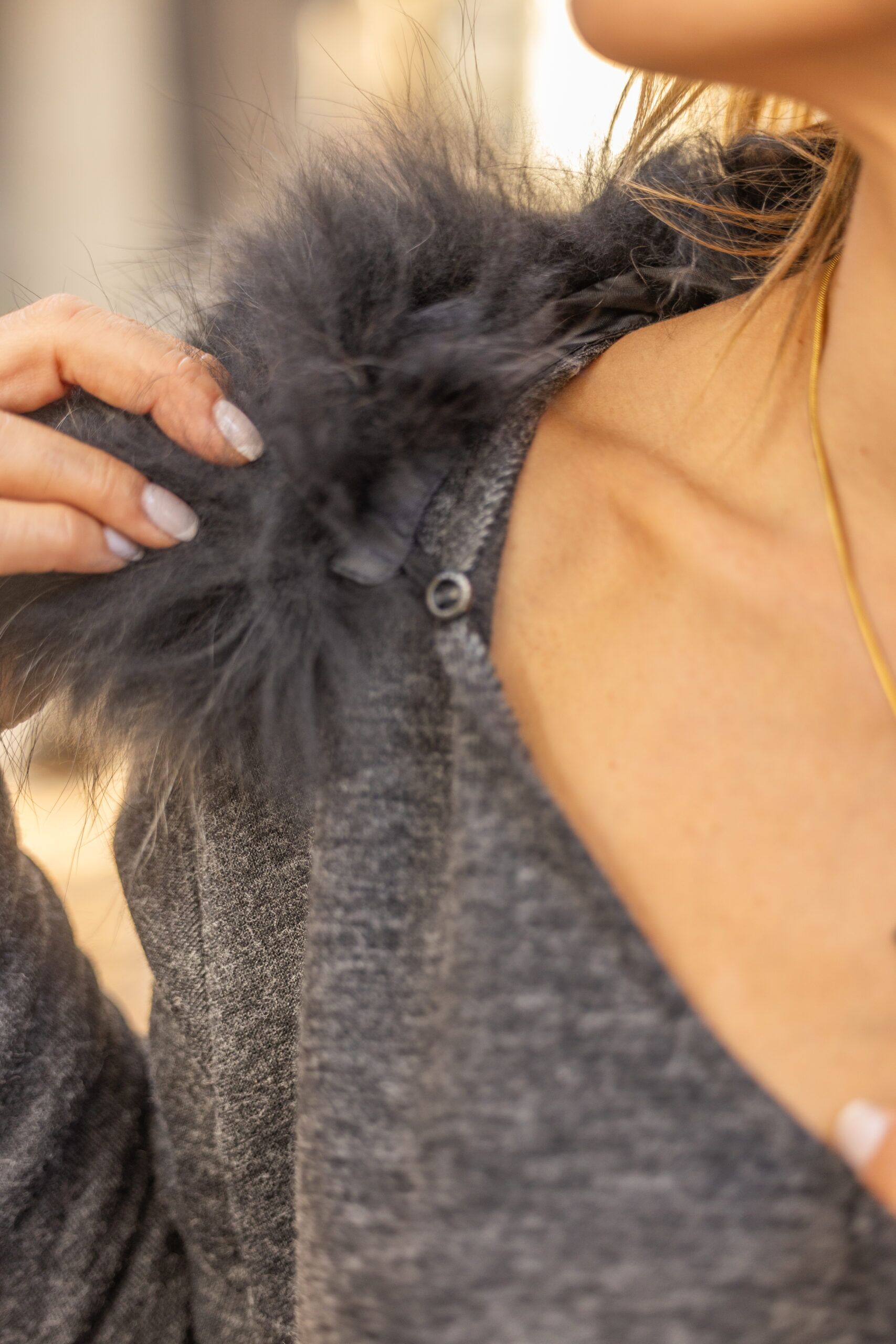 Vestido exclusivo Fox em malha cinza antracite com gola de pelo verdadeiro , gola removível. Com bolsos