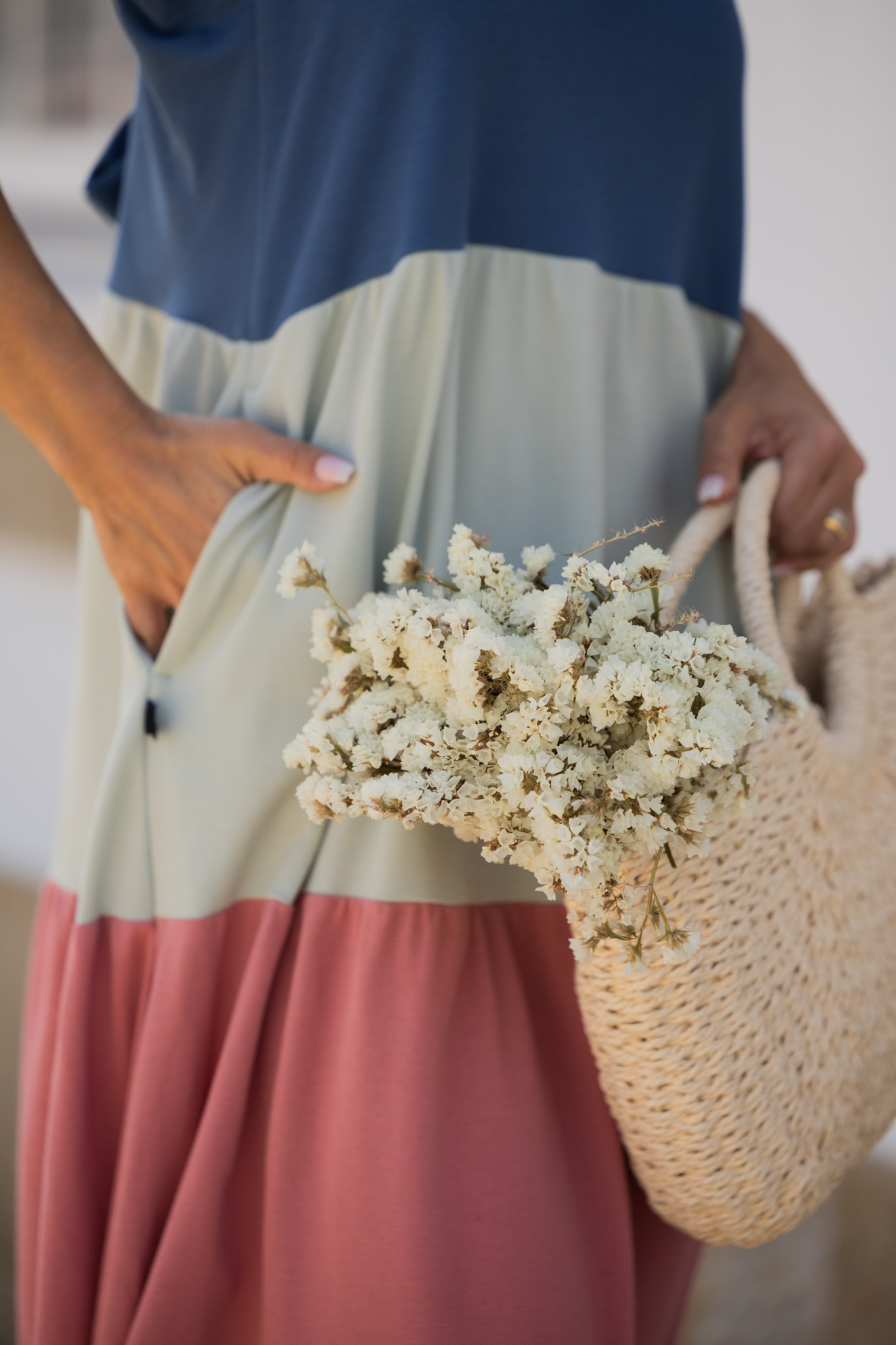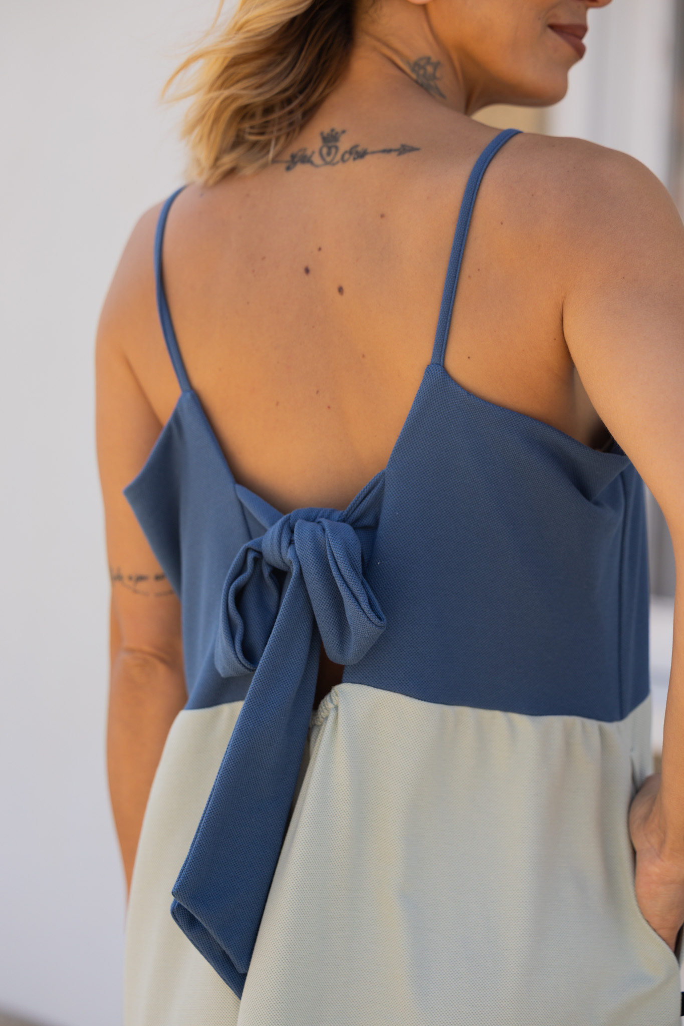 Vestido exclusivo Fox, em algodão piquet, com bolsos e laço nas costas.