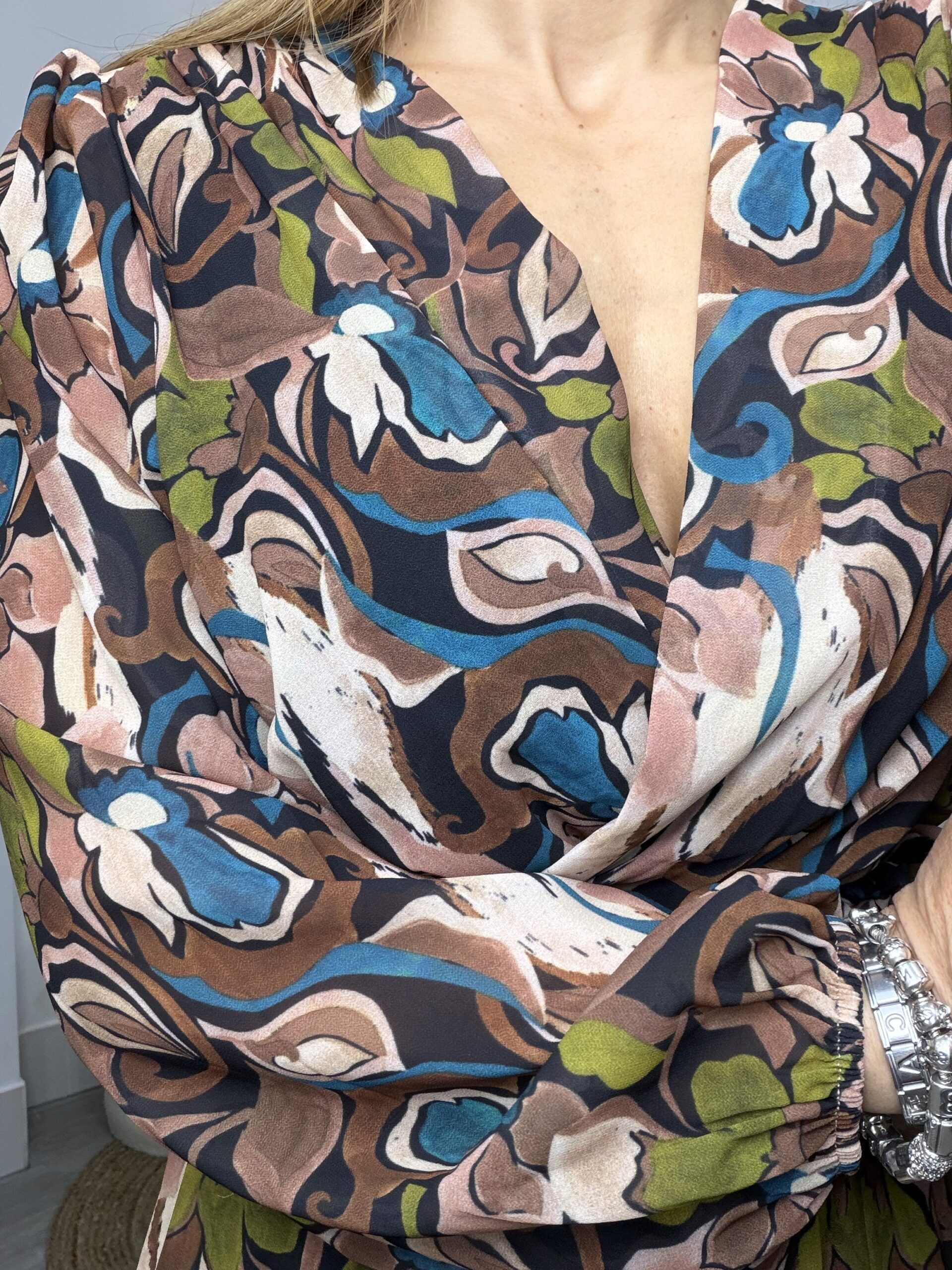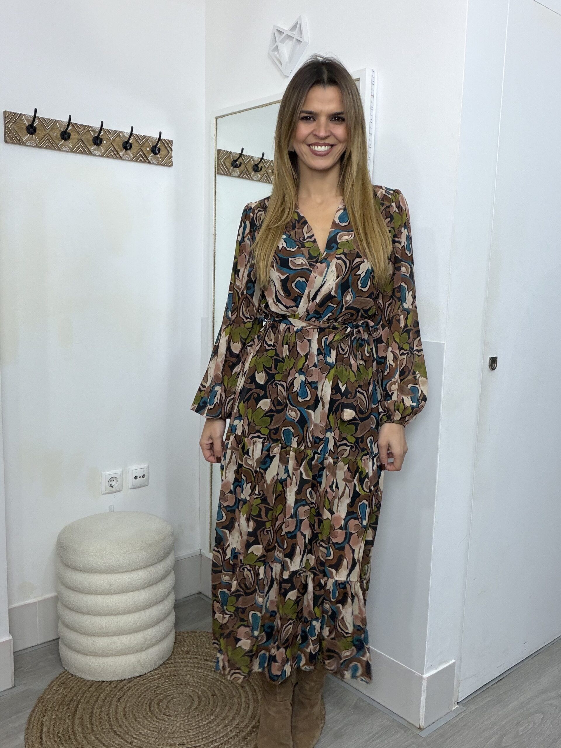 Vestido decote trespasse, com cinto do mesmo tecido.